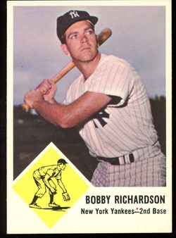 1963 Fleer Baseball Card (#25) of New York Yankees Star 2nd Baseman, Bobby Richardson. Card is EX-MT with some corner wear and no creases. No writing, pin holes, tape stains. See scan for centering.
