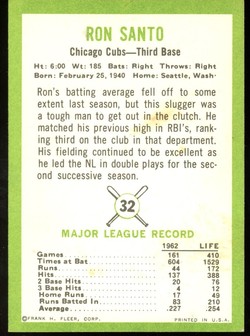 1963 Fleer Baseball Card (#32) of Chicago Cubs Hall-of-Fame 3rd Baseman, Ron Santo. Card is EX-MT with some light corner wear and no creases. No writing, pin holes, tape stains. Small stain on back. See scan for centering.