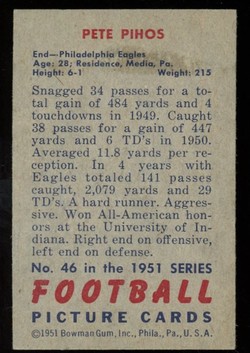 1951 Bowman Football Card (#46) Of Philadelphia Eagles Hall-of-Fame Wide Receiver, Pete Pihos.