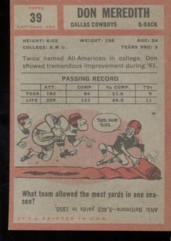 1962 Topps Football #039 Don Meredith Dallas Cowboys SP
