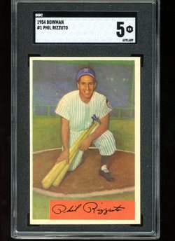 1954 Bowman Baseball Card (#1) of New York Yankees Hall-of-Fame Shortstop, Phil Rizzuto. Card is graded 5 EX (Excellent) by SGC. See scan for centering.