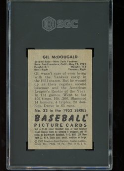 1952 Bowman Baseball Rookie Card (#33) of New York Yankees Star Infielder, Gil McDougald. Card is graded 6 EX-MT (Excellent to Mint) by SGC.