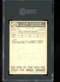 1959 Topps Football Rookie Card (#155) of Green Bay Packers Hall-of-Fame Running Back, Jim Taylor. Card is professionally graded 7 NM (Near Mint) by SGC.