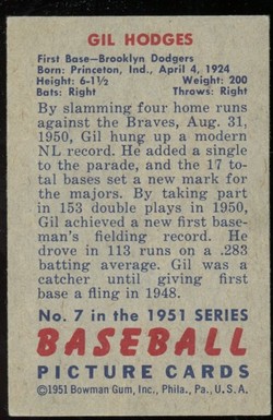 1951 Bowman Baseball Card (#7) of Brooklyn Dodgers Hall-of-Fame First Baseman, Gil Hodges. Card is EX+ with some corner wear and a light back crease in the lower right.