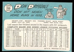 1965 Topps Baseball Card (#260) of Los Angeles Dodgers Hall-of-Fame Pitcher, Don Drysdale. Card is EX-MT with some corner wear and no creases. No writing, pin holes, tape stains. See scan for centering.