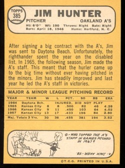 1968 Topps Baseball #385 Jim Catfish Hunter Oakland A's HOF