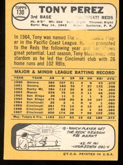 1968 Topps Baseball Card (#130) Featuring Cincinnati Reds Hall-of-Fame 1st Baseman, Tony Perez.
