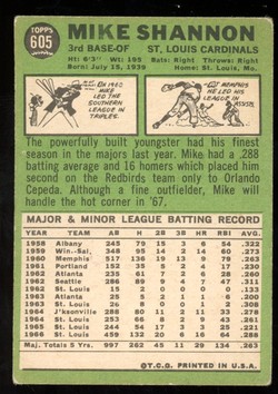 1967 Topps Baseball High Number Short Print Card (#605) of former St Louis Cardinals Infielder, Mike Shannon. Card is EX- with some corner wear/dings and a small surface crease. No pin holes, tape stains. See scan for centering.