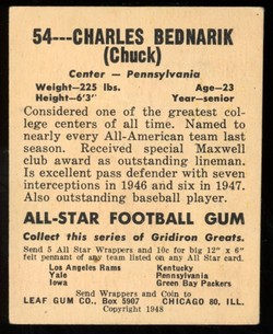 1948 Leaf Football High Number Rookie Card (#54 - Yellow Background) of Philadelphia Eagles Hall-of-Fame Linebacker, Chuck Bednarik. Card is VG with some corner wear and a horizontal crease. No writing, pin holes, writing. See scan for centering.