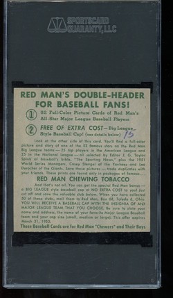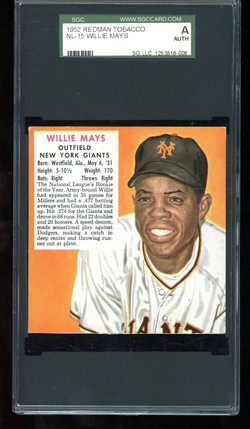 1952 Red Man Tobacco Baseball Card (# NL-15) of San Francisco Giants Hall-of-Fame Outfielder, Willie Mays. Card is professionally graded Authentic by SGC.