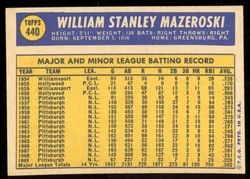 1970 Topps Baseball Card (#440) of Pittsburgh Pirates Hall-of-Fame 2nd Baseman, Bill Mazeroski. Card is EX-MT with some corner wear and no creases. No writing, pin holes, tape stains. See scan for centering.