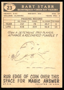 1959 Topps Football Card (#23) of Green Bay Packers Hall-of-Fame Quarterback, Bart Starr. Card is EX-MT with some corner wear and no creases. No writing, pin holes, tape stains. See scan for centering.