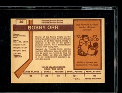 1973 - 1974 OPC O-Pee-Chee Hockey Card (#30) of Boston Bruins Hall-of-Fame Defenseman, Bobby Orr. Card is professionally graded 7.5 NM+ (Near Mint Plus) by SGC.