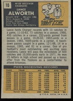 1971 Topps Football Card (#10) of San Diego Chargers Hall-of-Fame Wide Receiver, Lance Alworth. Card is EX-MT with some corner wear and no creases. No writing, pin holes, tape stains. Small ding in the upper right corner. See scan for centering.