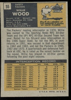 1971 Topps Football Card (#55) of Green Bay Packers Hall-of-Fame Safety, Willie Wood. Card is EX-MT+ with some light corner wear and no creases. No writing, pin holes, tape stains. See scan for centering.