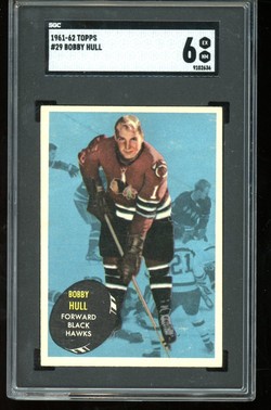 1961 - 1962 Topps Hockey Card (#29) of Chicago Black Hawks Hall-of-Fame Center, Bobby Hull. Card is graded 6 EX-MT (Excellent to Mint) by SGC.