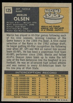 1971 Topps Football Card (#125) of Los Angeles Rams Hall-of-Fame Defensive Tackle, Merlin Olsen. Card is EX-MT with some corner wear and no creases. No writing, pin holes, tape stains. See scan for centering.