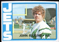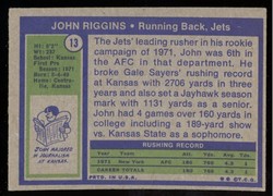 1972 Topps Football Rookie Card (#13) of New York Jets Hall-of-Fame Running Back, John Riggins. Card is EX-MT with some corner wear and no creases. No writing, pin holes, tape stains. See scan for centering.