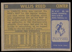 1971-1972 Topps Basketball Card (#30) Of New York Knicks Hall-of-Fame Center, Willis Reed. Card is EX-MT+ with some light corner wear and no creases. No writing, pin holes, tape stains. See scan for centering.