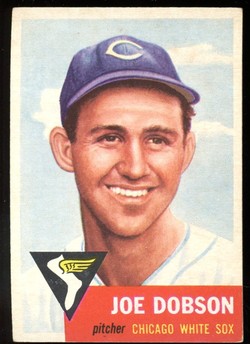 1953 Topps Baseball Card (#5) of former Chicago White Sox Pitcher, Joe Dobson. Card is EX+ with some corner wear and no creases. No writing, pin holes, tape stains. Small ding in the upper right corner. See scan for centering.